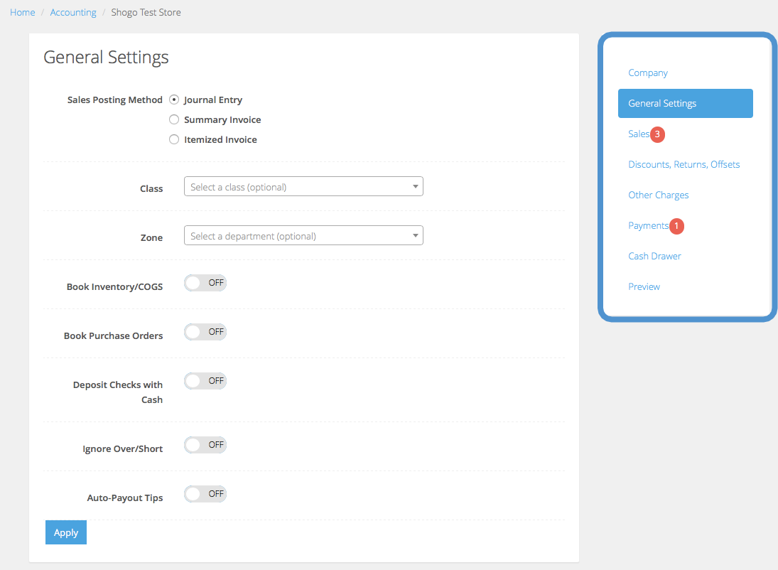The following section outlines each high level menu option in the Shogo accounting configuration process (located on the right side of your Accounting Settings):